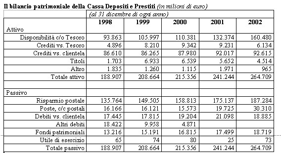 Dal lato degli impieghi, la Cassa finanzia il Tesoro e le altre amministrazioni pubbliche (soprattutto Regioni ed enti locali). I conti correnti della Cassa in Tesoreria, la cui consistenza a fine 2002 era di 160 miliardi, rappresentano il veicolo attraverso il quale il risparmio postale è andato a finanziare lo Stato centrale.