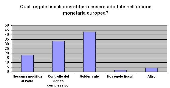 Nella prima domanda si chiedeva quali regole fiscali dovrebbero essere adottate nell’Unione monetaria europea. Le possibili opzioni di risposta (con la possibilità di barrarne più di una) erano: