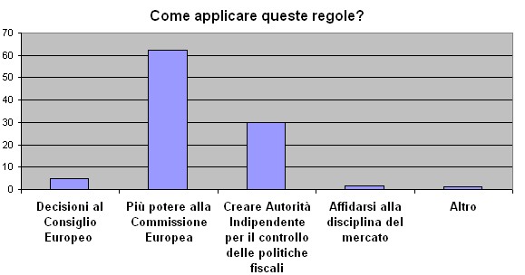 Molti gli iscritti alla newsletter che hanno risposto alle nostre domande sul futuro del Patto di Stabilità e crescita. La grande maggioranza propende per una modifica delle regole fiscali dellUnione. Che dovrebbe escludere le spese per investimento dal vincolo del deficit oppure concentrare lattenzione sul debito piuttosto che sul disavanzo anno per anno. E ad applicare le nuove regole dovrebbe essere la Commissione. Giorni fa avevamo proposto agli iscritti alla newsletter de staging.lavoce.info un breve sondaggio sul futuro del Patto di Stabilità e crescita. 1. Tenere il Patto di Stabilità e Crescita così com’è. Sembra evidente che quasi nessuno pensa che non ci vogliano regole: solo l’1,5 per cento di coloro che hanno risposto al sondaggio dichiara che l’Unione monetaria non dovrebbe avere alcuna regola fiscale formale. Nella seconda domanda si chiedeva di valutare alcune delle proposte per applicare le regole fiscali all’interno dell’Unione. La domanda recitava: Come applicare queste regole? Queste le opzioni. 1. Lasciando al Consiglio europeo (dunque ai Governi nazionali) il potere di Queste le risposte: Non sembra che i nostri lettori abbiano molta fiducia nel Consiglio europeo (solo il 5 per cento) e quindi nell’operato dei Governi nazionali. “I controllati non devono controllare”, sembrerebbe il parere degli intervistati, che preferiscono attribuire l’applicazione delle regole alla Commissione europea (il 62 per cento) oppure a un’autorità indipendente appositamente costituita (il 30 per cento). Pochissimi mostrano, invece, fiducia nell’efficacia delle sanzioni del mercato. Queste le conclusioni dei nostri lettori, ma saranno poi utili questi sondaggi? Infine abbiamo posto le stesse domamde ad un gruppo di esperti di economia pubblica e macroeconomia. Gli esperti sembrano avere meno fiducia nella “golden rule”, terrebbero il Patto cos’ì com’è, eventualmente spostando l’enfasi dal deficit anno per anno al debito pubblico. E sono concordi con i nostri lettori nell’affidare più potere alla Commissione Europea nell’attuazione delle nuove regole.