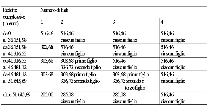 Detrazioni per figli (e altri famigliari) a carico: fino al 2004 nella determinazione dellIrpef si teneva conto dei figli (e altri famigliari) a carico del contribuente attraverso detrazioni di imposta. Nel 2004 le detrazioni in questione erano articolate secondo la tabella seguente: